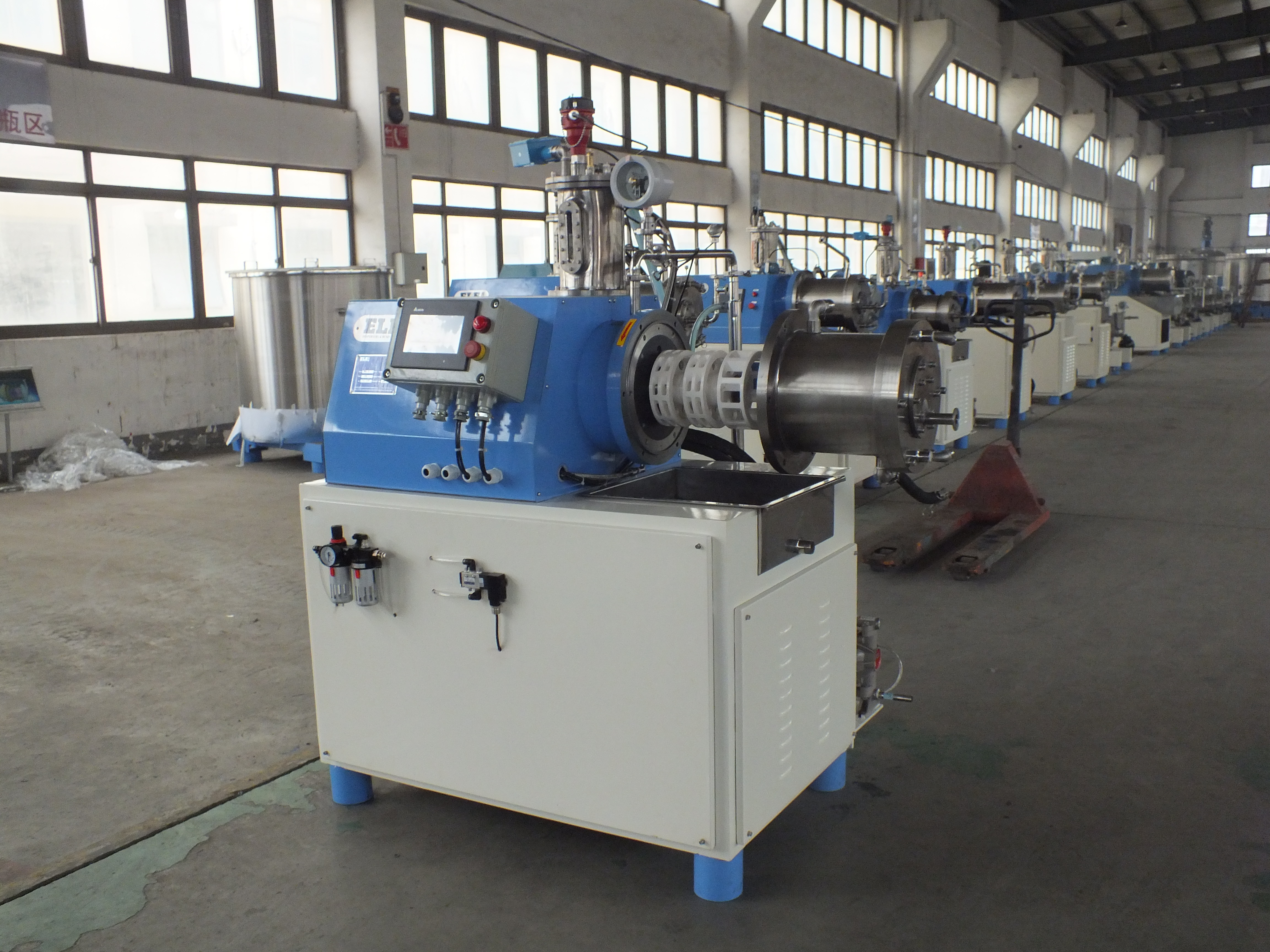 公司的主打产品之一是新型篮式研磨机,主要用于物料的分散与研磨一体化加工。该设备采用独特的自吸叶轮设计,进料顺畅不堵塞,特殊的防反流装置确保研磨珠不泄漏、不卡珠。其多重冷却系统能有效控制研磨温度,配合特殊的出料滤网设计,可使用超细研磨珠,使物料细度达到纳米级别,且粒度分布均匀,广泛应用于涂料、油墨、色浆等行业的精细化生产。